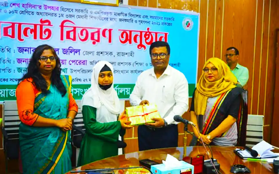 ডিসি আবদুল জলিলের সাথে অতিরিক্ত জেলা প্রশাসক জয়া মারিয়া পেরেরা এবং জেলা পরিসংখ্যান অফিসের উপ-পরিচালক কাজল রেখা শিক্ষার্থীদের মধ্যে ট্যাবগুলো বিতরণ করেন।
