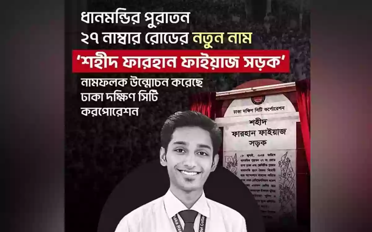 ধানমন্ডির পুরনো ২৭ নাম্বার রোডের নতুন নামকরণ হয়েছে ‘শহীদ ফারহান ফাইয়াজ সড়ক’ । এর নামফলক উন্মোচন করেছে ঢাকা দক্ষিণ সিটি কর্পোরেশন।
