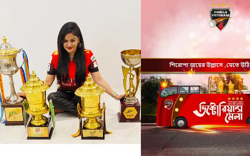 গতো সোমবার (২০ মার্চ) কুমিল্লা শহর জুড়ে ছাদখোলা বাসে শোডাউন করেন। “ভিক্টোরিয়ান্স” প্রেমীরা সড়কের দুপাশে দাঁড়িয়ে ফুল এবং স্লোগানে তাদের স্বাগত জানান। বিকালের দিকে জোগ দেন লালমাই উপজেলার জামতলী “ভিক্টোরিয়ান্স মেলায়”। জমকালো আয়োজনে চিত্রনায়ক ফেরদৌস ও চিত্রনায়িকা পূর্ণিমার মনোমুগ্ধকর উপস্থাপনায় অনুষ্ঠিত হয় মনোজ্ঞ সাংস্কৃতিক অনুষ্ঠান, আলোচনা পর্ব ও চ্যাম্পিয়ন ট্রফি প্রদর্শন। এছাড়াও ছিলেন অ্যাশেজ ব্যান্ড, সংগীতশিল্পী কণা, প্রিতম হাসানসহ একাধিক তারকা উপস্থিত ছিলেন।