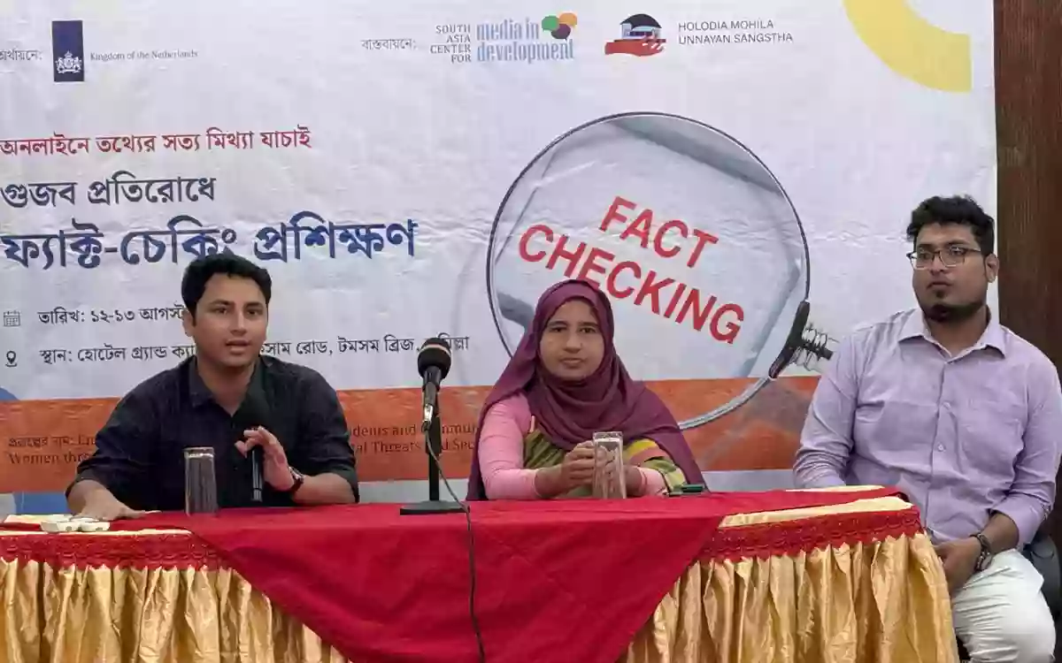 প্রশিক্ষণ কর্মশালায় ফ্যাক্ট চেকিংয়ের উপর আলোচনা করেন ‘এজেন্সি ফ্রান্স প্রেস’ এর (এএফপি) ফ্যাক্ট চেকিং এডিটর কদরুদ্দিন শিশির এবং ফ্যাক্ট চেকিং মিডিয়া প্লাটফর্ম ‘ডিসমিসল্যাব‘ এর রিসার্চ-লিড মিনহাজ আমান। কর্মশালায় উভয় প্রশিক্ষকই সংবাদ প্রকাশের ক্ষেত্রে সত্যতা নির্ণয় বা ফ্যাক্ট চেকিংয়ের বিভিন্ন বিষয় সম্পর্কিত পদ্ধতি, উপায় ও সতর্কতার বিষয়ে অংশগ্রহণকারীদের প্রশিক্ষণ প্রদান করেন।
