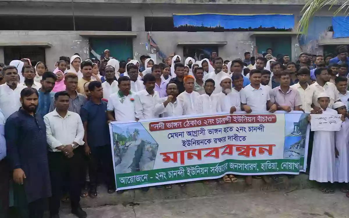 মঙ্গলবার (২৯ অক্টোবর) দুপুরে উপজেলার চানন্দী ইউনিয়নের থানারহাট বাজার এলাকায় মেঘনা নদীর তীরে নদী ভাংগনের শিকার হাজার হাজার এলাকাবাসী, বাজারের ব্যবসায়ী, স্কুল-মাদ্রাসার শিক্ষক-শিক্ষার্থী, মসজিদের ইমামসহ বিভিন্ন শ্রেনীপেশার মানুষ এ মানববন্ধন কর্মসূচিতে অংশগ্রহন করে।