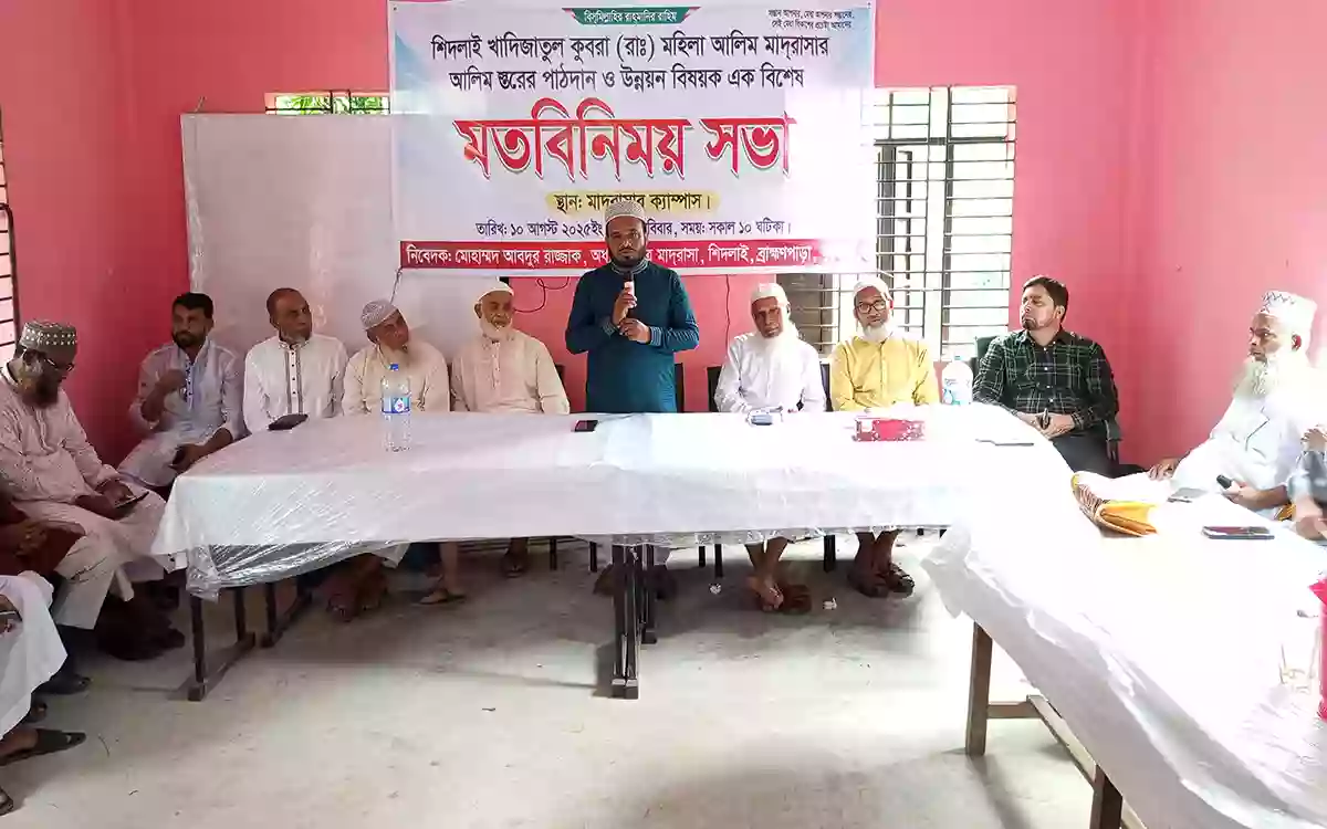 রবিবার (১০ আগস্ট) দুপুরে কুমিল্লার ব্রাহ্মণপাড়া উপজেলার ঐতিহ্যবাহী দ্বীনি শিক্ষা প্রতিষ্ঠান “শিদলাই খাদিজাতুল কুবরা (রাঃ) মহিলা আলিম মাদ্রাসার” আলিম স্তরের পাঠদান ও উন্নয়ন বিষয়ক এক মতবিনিময় সভায় প্রধান অতিথির বক্তব্য কুমিল্লা-৫ (বুড়িচং-ব্রাহ্মণপাড়া) আসনে জামায়াতে ইসলামীর মনোনীত প্রার্থী ও বুড়িচং-ব্রাহ্মণপাড়া উন্নয়ন ফোরামের চেয়ারম্যান ডক্টর এডভোকেট মোবারক হোসাইন এসব কথাগুলো বলেন।