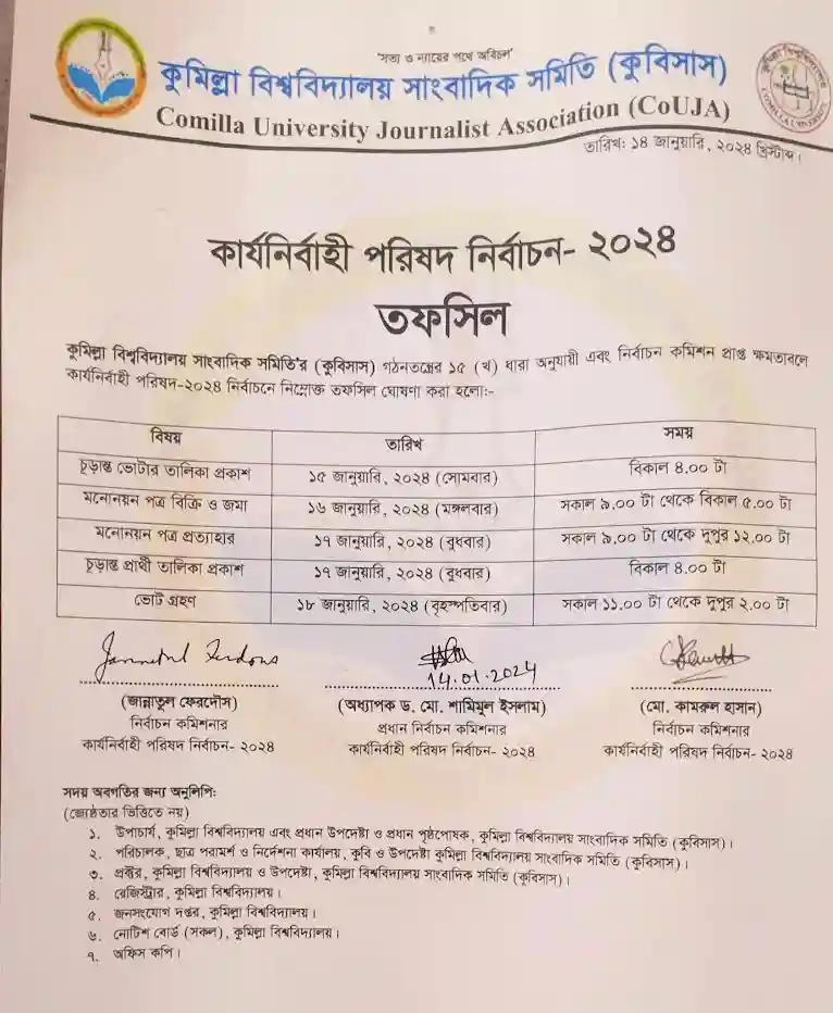কুমিল্লা বিশ্ববিদ্যালয়ে কর্মরত সাংবাদিকদের সংগঠন কুমিল্লা বিশ্ববিদ্যালয় সাংবাদিক সমিতির (কুবিসাস) কার্যনির্বাহী পরিষদ-২০২৪ এর নির্বাচনের তফসিল ঘোষণা করা হয়েছে।