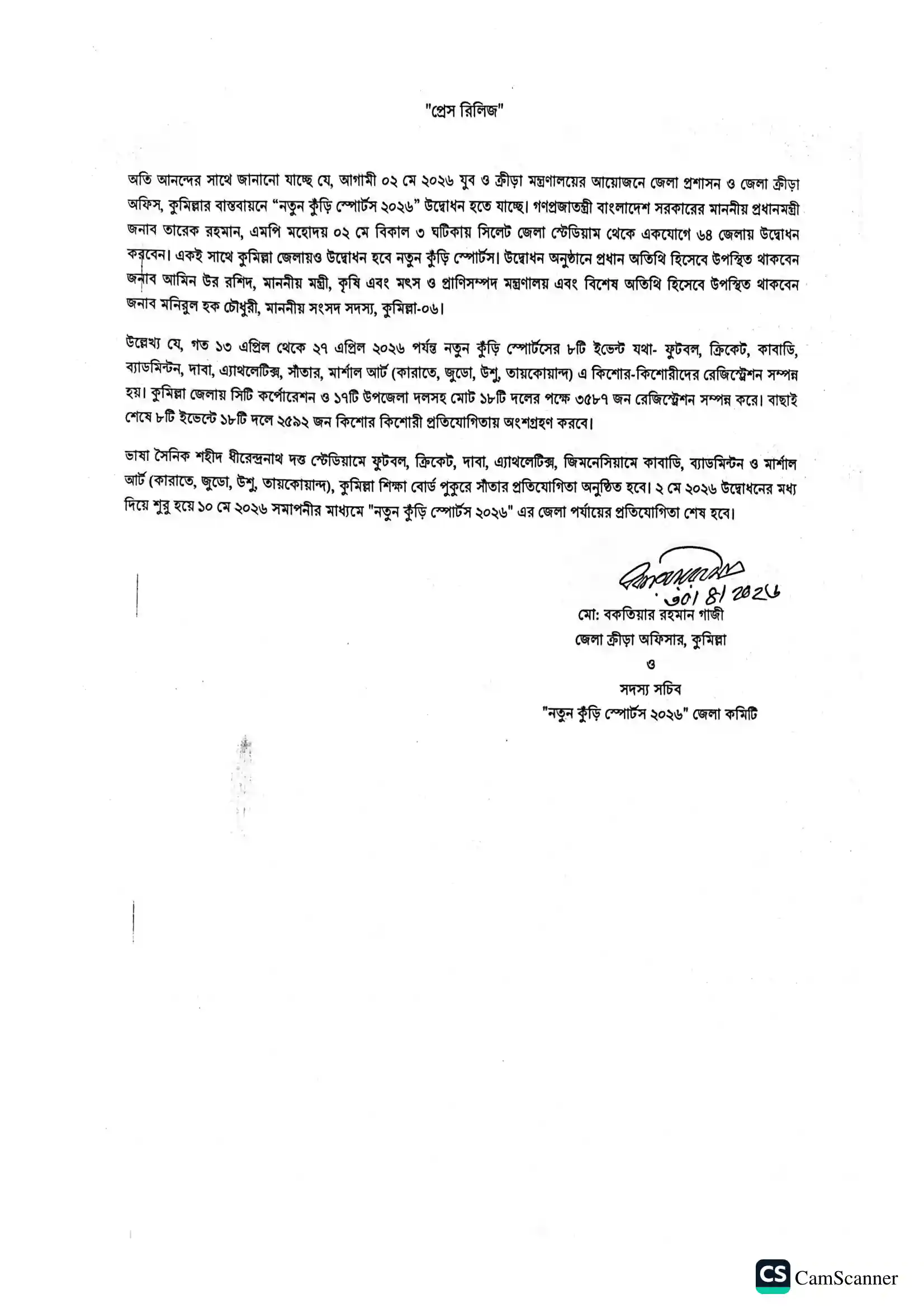 মো. বকতিয়ার রহমান গাজী, জেলা ক্রীড়া অফিসার, কুমিল্লা ও ‘নতুন কুঁড়ি স্পোর্টস ২০২৬’ জেলা কমিটির সদস্য সচিব স্বাক্ষরিত এক প্রেস বিজ্ঞপ্তিতে এ তথ্য জানানো হয়েছে।
