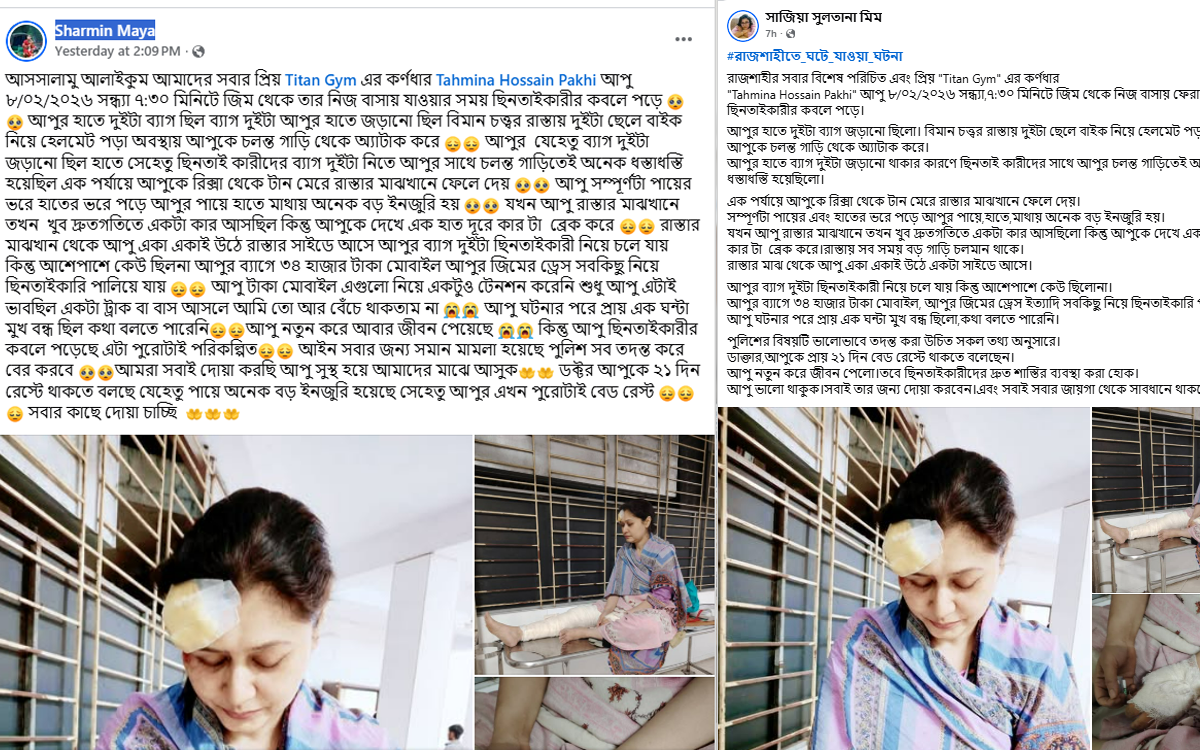 প্রকৃত ঘটনা অনুসন্ধানে জানা গেছে, গত ৮ ফেব্রুয়ারি ২০২৬ সন্ধ্যা ৭:৩০ মিনিটে রাজশাহীর বিমানবন্দর রোডে “Tahmina Hossain Pakhi” নামক এক নারী জিম থেকে বাসায় ফেরার পথে ছিনতাইকারীদের কবলে পড়েন। তার হাতে দুইটি ব্যাগ জড়ানো ছিল। দুইজন হেলমেট পরিহিত যুবক মোটরবাইকে করে চলন্ত রিকশা থেকে ব্যাগ ছিনতাই করার চেষ্টা করে।