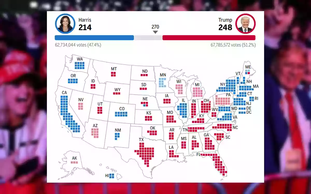 যুক্তরাষ্ট্রের প্রেসিডেন্ট নির্বাচনে ইলেক্টোরাল ভোটে এখন পর্যন্ত স্পষ্ট ব্যবধানে এগিয়ে আছেন রিপাবলিকান প্রেসিডেন্ট প্রার্থী ডোনাল্ড ট্রাম্প। দোদুল্যমান রাজ্যের ভোট গণনাতেও ট্রাম্পের শক্তিশালী অবস্থান ফুটে উঠেছে। পাশাপাশি, ট্রাম্পের দল রিপাবলিকান পার্টি সিনেট ও প্রতিনিধি পরিষদেও এগিয়ে। তাঁর জন্য প্রস্তুত হচ্ছে মঞ্চ।