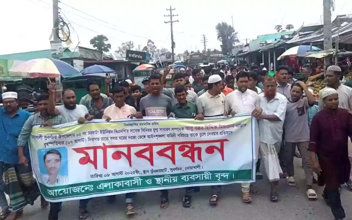 নোয়াখালীর সুবর্ণচর উপজেলার চরবাটা ইউনিয়ন বিএনপির যুগ্ম সম্পাদক আবু বক্কর সিদ্দিক মিজান মাঝিকে আইনশৃঙ্খলা বাহিনীর পরিচয়ে হাত-পা ও চোখ বেঁধে তুলে নেওয়ার প্রতিবাদে এবং তাঁর মুক্তির দাবিতে মানববন্ধন ও বিক্ষোভ মিছিল করেছে স্থানীয় এলাকাবাসী ও ব্যবসায়ীরা।