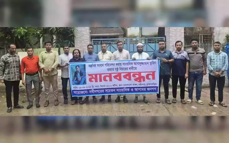 নবীনগরে সাংবাদিক তুহিনের হত্যাকারিদের বিচার দাবিতে মানববন্ধন